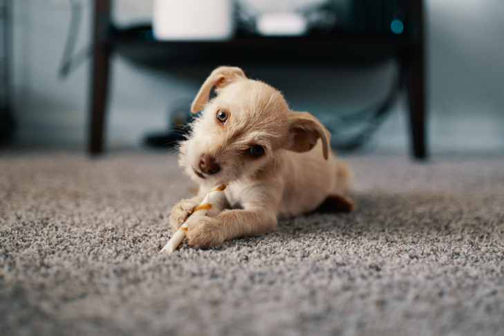 Just like human babies, puppies love to teethe on just about anything they can get their paws on until their teeth are fully grown in. Puppy teeth begin to fall out to make room for their 42 adult teeth by 3-to-4 months old. It’s not until they are 6-months when their adult teeth start growing in. This can be quite the struggle and it is advised to keep a close eye on your puppy to make sure they don’t chew on anything of importance. Having lots of dog chew toys around is key to helping your puppy’s teething stage goes somewhat seamlessly.