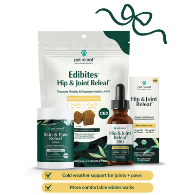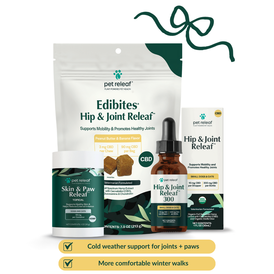 Save 25% when you bundle our Hip & Joint Releaf Edibites, Oil, and Skin & Paw topical for winter walk support