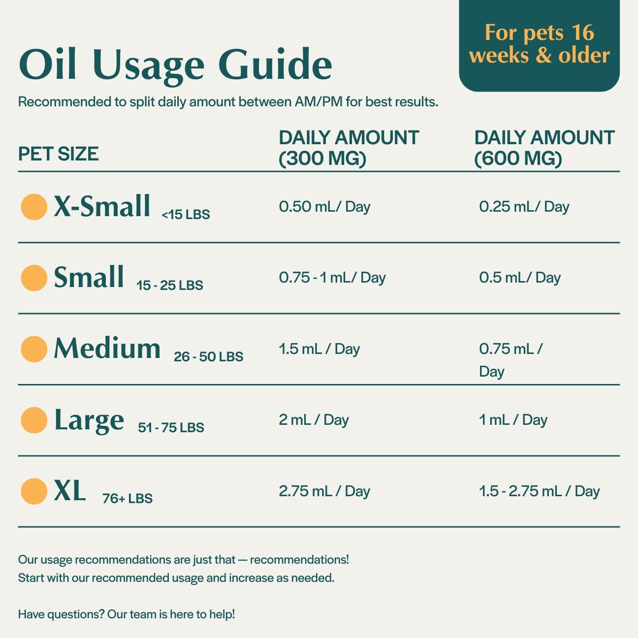 Our Hemp Oil is easily administered – simply place the dropper in your pet’s mouth